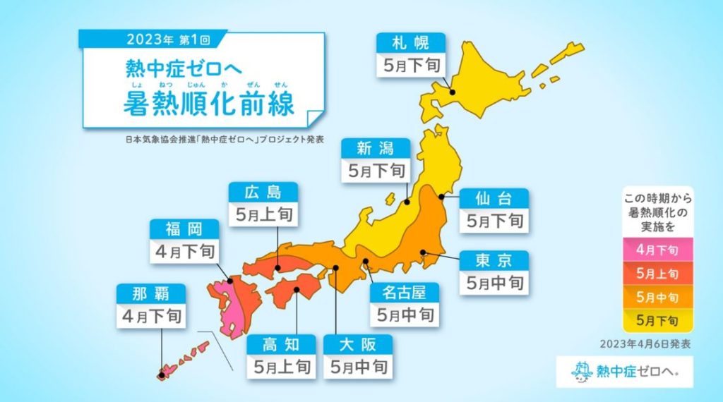 これによると、沖縄や九州では4月下旬から、中国四国地方では5月上旬、近畿から関東地方は5月中旬、東北地方や北海道は5月下旬から、暑さに体を慣らすことがよいとされています。
