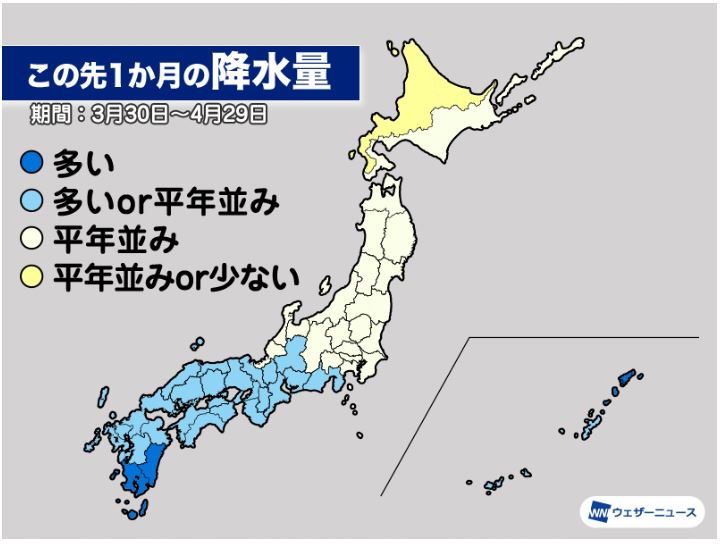 一方で降水量は全国的には平年並み、もしくは平年よりも多い予想で、西日本では季節外れの大雨に注意が必要とされています。