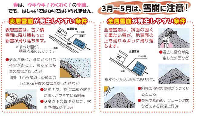春に起きる災害の内、融雪洪水や雪崩などは積雪の多い地域特有の災害ですが、登山や観光で訪れる方も多いため知っておくとよいでしょう。