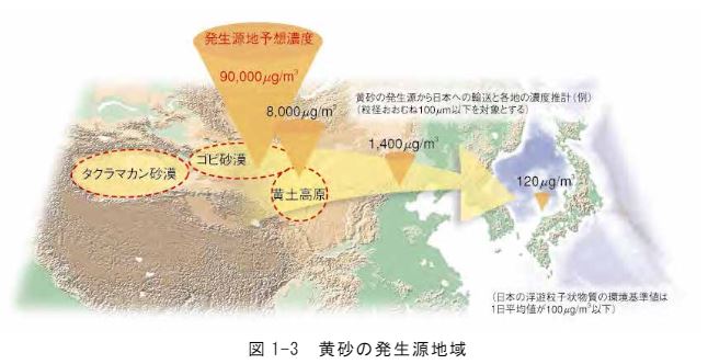 黄砂が起きる原因は、ユーラシア大陸内陸部のタクラマカン砂漠、ゴビ砂漠や黄土高原などで発生する砂嵐によって、数千メートルの上空に巻き上げられた土壌が、偏西風に乗って中国・韓国・日本に飛来することです。