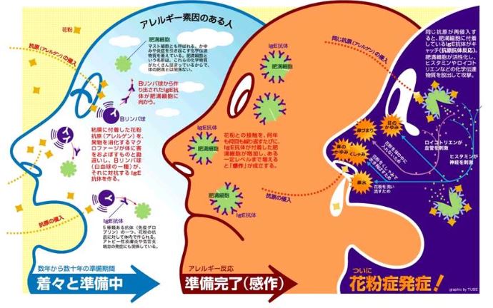 花粉が体内に入ってもすぐに花粉症になる訳ではなく、アレルギー素因のある方は体内に侵入した花粉に対抗するために抗体を作り出します。抗体が十分な量に達すると過剰に反応して、目のかゆみや鼻水など花粉症の症状が現れるのです。