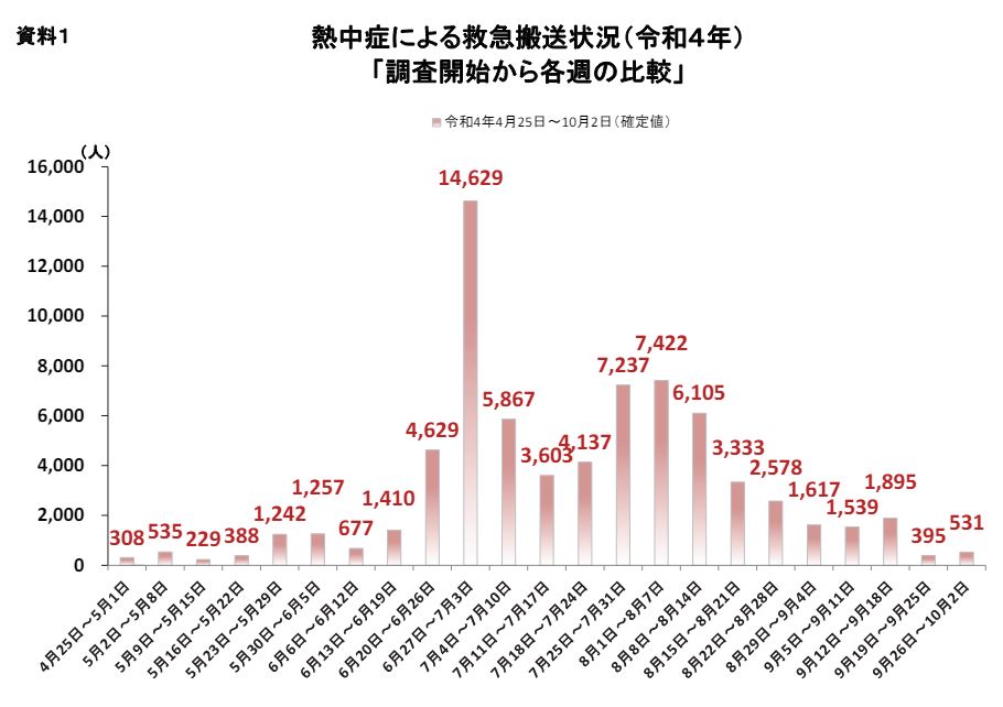 次のグラフは総務省が公開している報道資料で、令和4年における熱中症による救急搬送状況です。グラフを見ればお分かりのように、4月25日~5月1日までの1週間で308人の方が熱中症にて救急搬送されています。