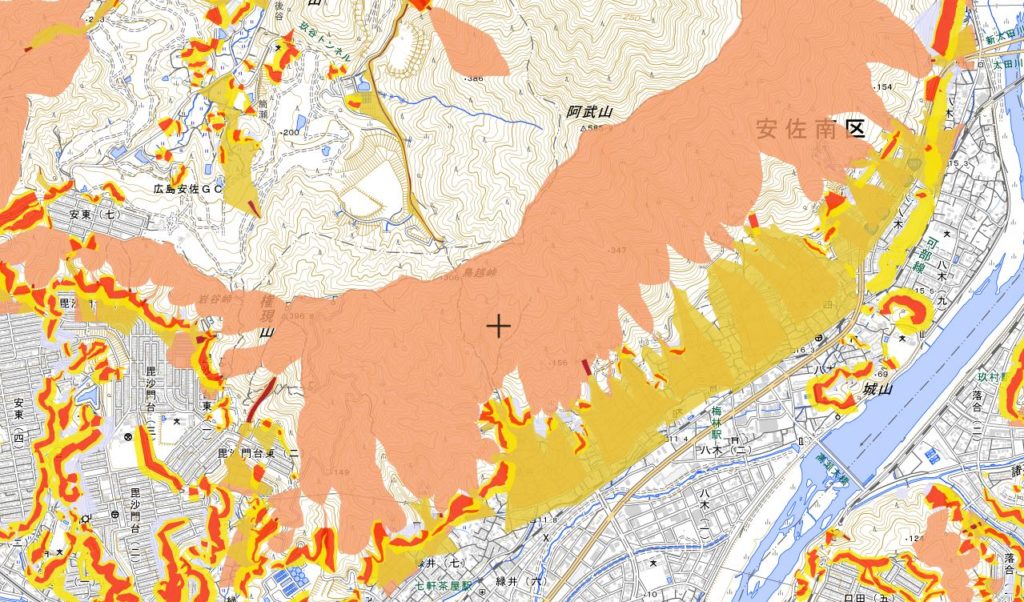土砂災害には、大きく分けてがけ崩れ(急傾斜地の崩壊)、土石流、地滑りの3種類に分類されていますが、先の安佐南区の画像のとおり、ハザードマップにはさまざまな着色がされています。