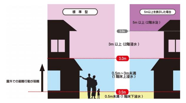 つまり、0.5~3.0mの範囲は2階に垂直避難するか、避難所に避難することが推奨され、3.0m 以上では2階も水没するので、避難所に避難することが望ましいとされています。