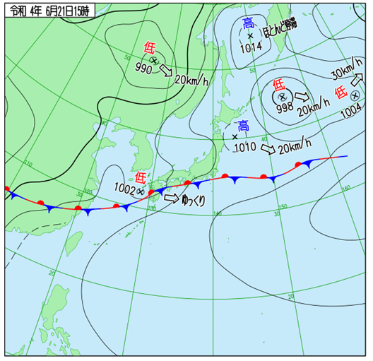 では次に、梅雨になるとどうして雨が降る日が多くなるのかというと、これは先の画像のとおり、梅雨前線が日本列島に停滞するからです。