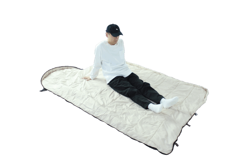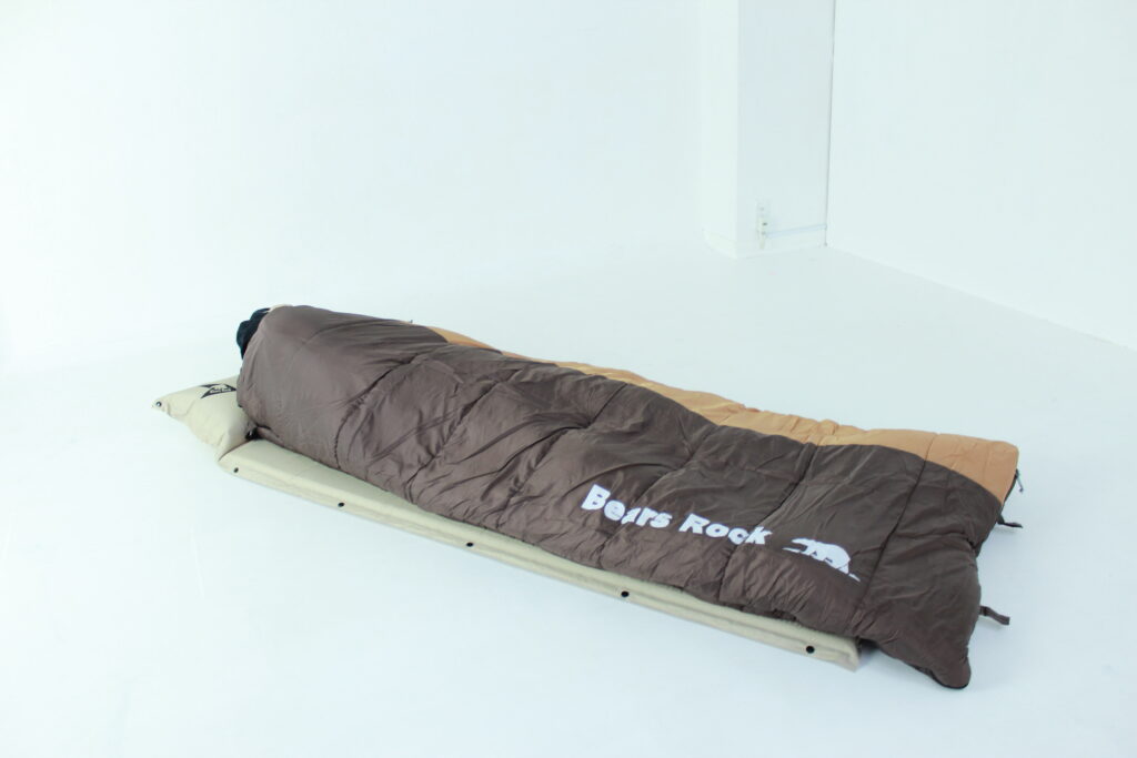【Bears Rockインフレータブルマット3㎝と封筒型-15℃寝袋で寝ているイメージ】